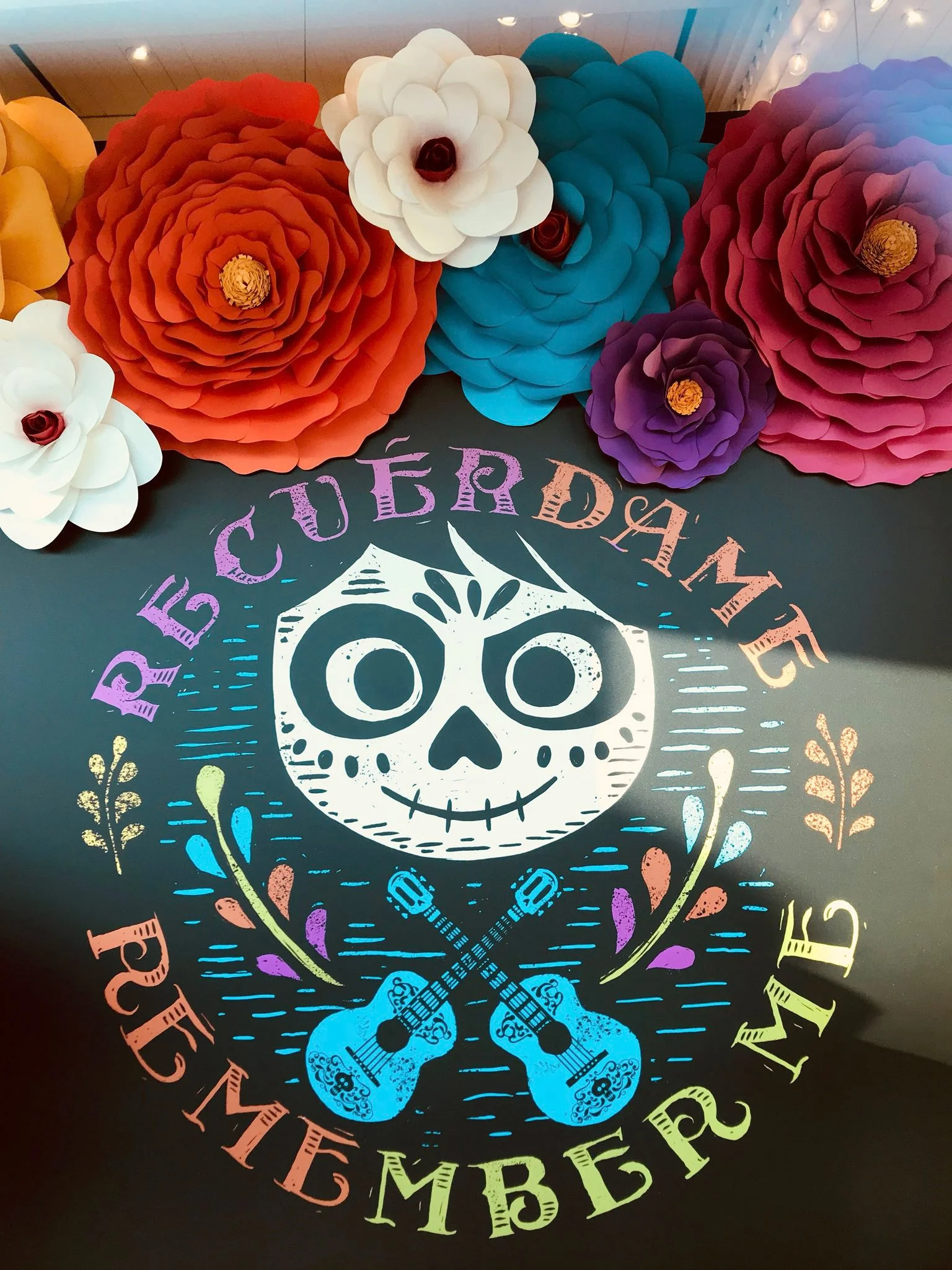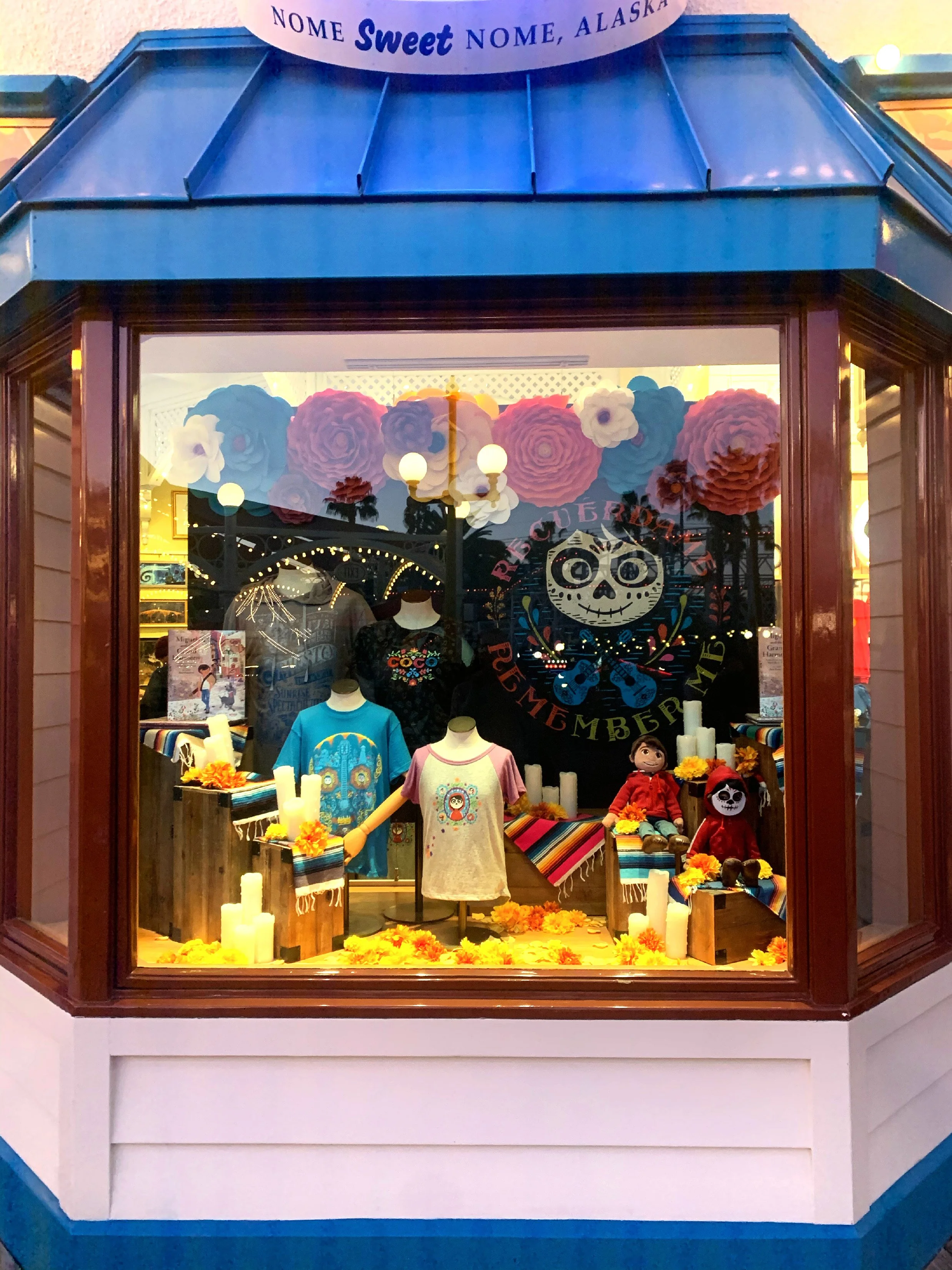 Dia de los Muertos inspired flower display in the window of Knick's Knacks at Pixar Pier